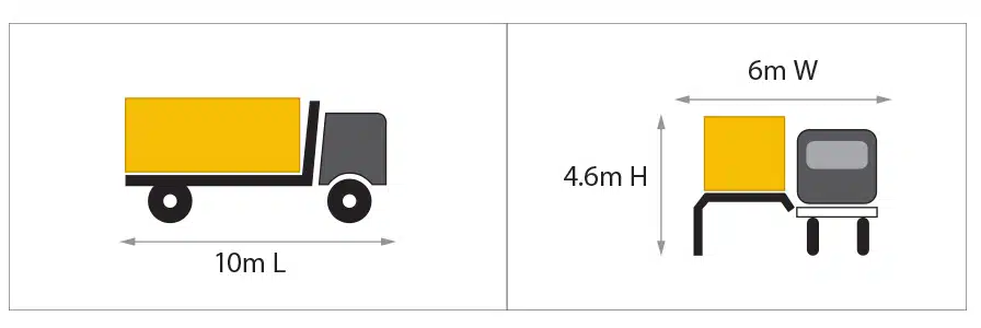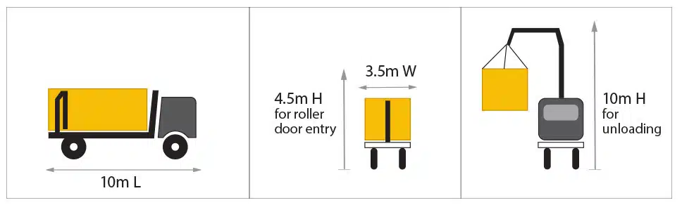 Height 4.6m (15.1ft) for roller door entry and 10m (33ft) for unloading, Length 10m (33ft), Width 3.5m (11.5ft).