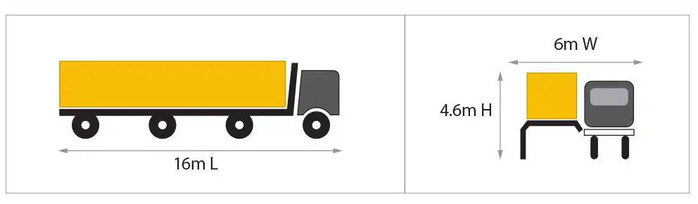 Height 4.6m (15.1ft), Width 6m (19.6ft), Length 16m (53ft)